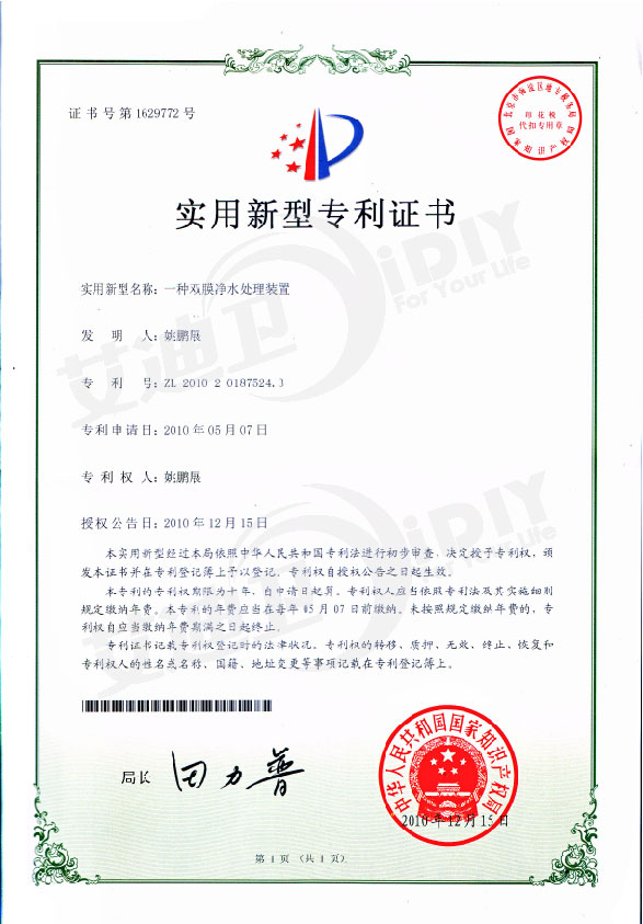 艾迪衛雙膜凈水處理裝置榮獲實用新型專利