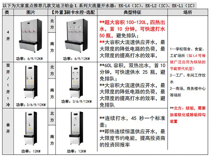 ----》iDIY步進式:節能EK-L2和EK-L4系列,大容積大流速供應開水,最大限度的降低電路的負荷,最大限度的提高打水的效率,避免排隊;經典產品:EK-B60IC 和 EK-B120L4IC(可附上重點產品特征)
