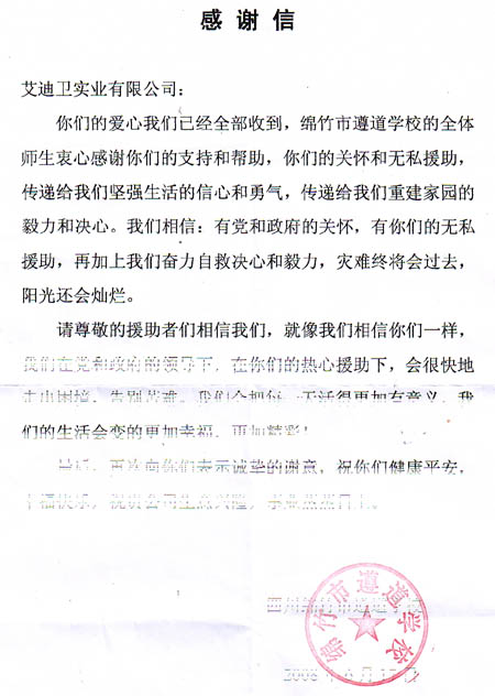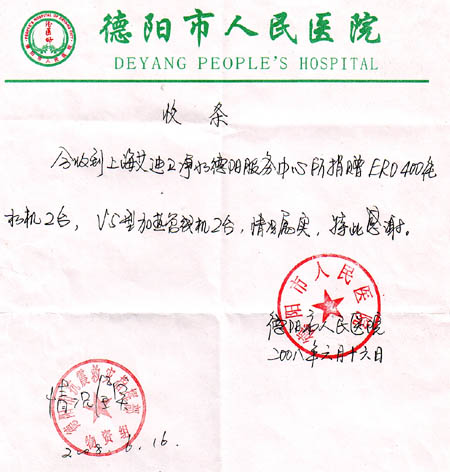 2008年6月15日11時(shí)38分援助德陽(yáng)市人民醫(yī)院急診大廳小型直飲水設(shè)備安裝調(diào)試完備,11:48分由四川德陽(yáng)服務(wù)中心與護(hù)士長(zhǎng)交接,此批由艾迪衛(wèi)援建的直飲水設(shè)備交付德陽(yáng)市人民醫(yī)院使用。此次艾迪衛(wèi)為地震災(zāi)區(qū)災(zāi)后應(yīng)急飲水援建水站的項(xiàng)目由此拉開(kāi)序幕,接下來(lái),我們還要前往重災(zāi)區(qū)綿陽(yáng)什邡,深入災(zāi)區(qū),解決更多人的飲水問(wèn)題。